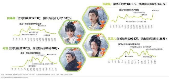 主演张凌赫、田曦薇声量全程高位,是剧集社媒传播核心主力,张凌赫长尾热度突出;配角邓凯、孔雪儿声量随剧集有所提升,并通过剧集中高光点实现某个时间点的声量峰值。
