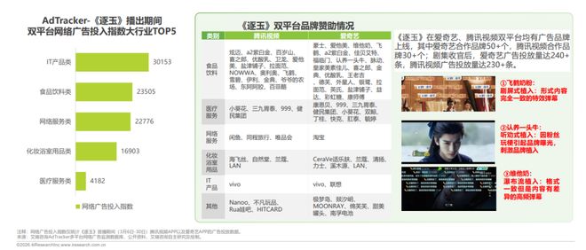 IT产品类、食品饮料类、网络服务类、化妆浴室用品类以及医疗服务类广告投放前五的行业。品牌覆盖全品类,多形式植入实现品牌与剧集深度绑定,突出商业价值。
