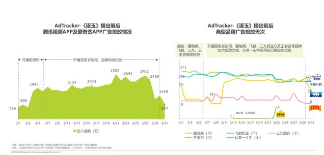 开播前投放预热带动声量起势,播中投放高峰同步热度峰值;爱他美、飞鹤乳业、三九医药以及王老吉等品牌开播前即启动投入,播中持续加码,全周期投放稳定;认养一头牛开播后启动追投,借剧集热度、网友玩梗放大品牌曝光。