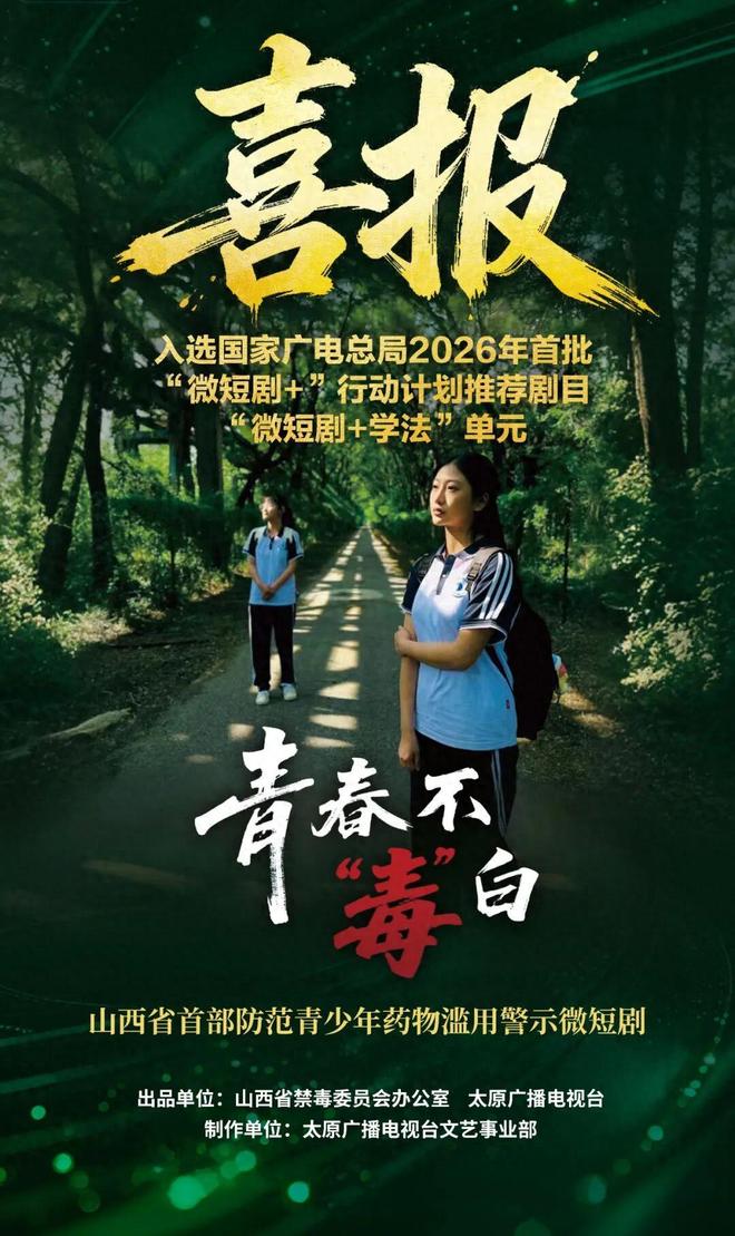 4月15日,2026年首批“微短剧+”行动计划推荐剧目在第十三届中国网络视听大会微短剧高质量发展论坛上正式发布,共有116部优秀微短剧入选。本次发布的推荐片单围绕大会“繁荣新大众文艺,共创新时代视听”主题,覆盖旅行、学法、科普、经典、非遗、运动、AIGC七大核心单元。山西省禁毒办指导创作的禁毒微短剧《青春不 “毒” 白》,成功入选#跟着微短剧来学法# 单元。