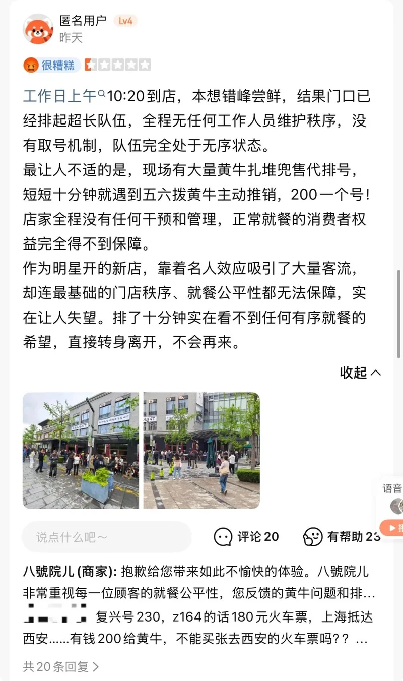 4月8日试营业,“八号院儿”开业不到一周,就登顶大众点评“上海陕菜热门榜”第一,连着几天挂在热搜上。闲鱼代排队从60元炒到500元,有顾客从浙江嘉善早上7点出发,赶到上海,中午12点还没进店;有人等了7个小时才吃上一碗面。