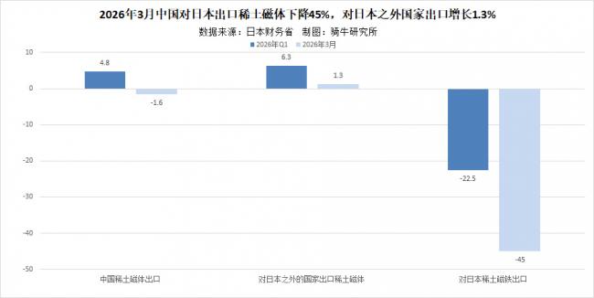 然而,对日本的出口却大幅收缩。一季度,中国对日稀土磁铁出口仅627吨,同比下降22.5%;对其他国家出口15374吨,增长6.3%。3月对日磁铁出口约184吨,环比降17%、同比降45%,创九个月新低;对其他国家出口5054吨,同比增长1.3%。更严峻的是,3月中国对日稀土中间材料(含氧化物)出口量暴跌近90%。