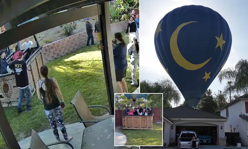 (加西网综合) 美国加利福尼亚州特梅库拉(Temecula)周六发生一起罕见“空中意外”:一只载有13人的热气球因燃料不足及风向变化,被迫紧急降落,最终精准落在一户居民狭小的后院草坪上,场面宛如电影情节。