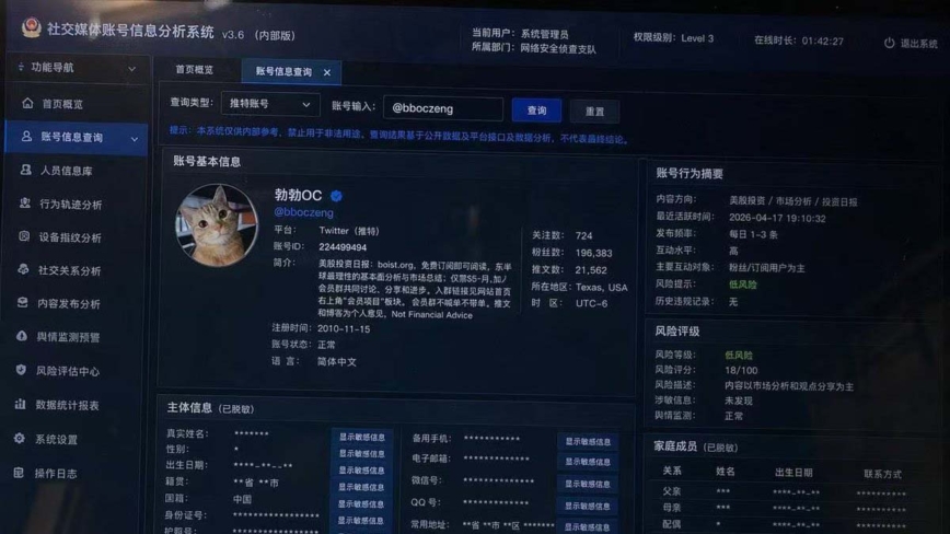 该系统不仅显示账号头像、ID、粉丝数量、发文频率,IP地址、登录设备、历史访问轨迹,还把这些信息串联起来,形成一套完整的行为记录。