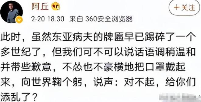 那个时候疫情不明朗,官方还没调查清楚,而阿丘作为一个名人,完全不考虑后果,自作聪明地在微博上发文说:疫情是中国的责任,让中国给全世界道歉。