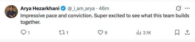 电磁超级智能企业Arena Physica CTO Arya Hezarkhani评论称:“令人惊叹的速度和信念。非常期待看到这个团队共同努力的成果。”