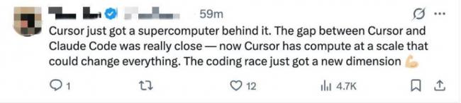 有网友认为:“Cursor背后现在有了一台超级计算机。Cursor与Claude Code之间的差距原本已经非常接近——而如今Cursor拥有了规模空前的算力,这可能会改变一切。编程竞赛刚刚迎来了一个全新的维度。”
