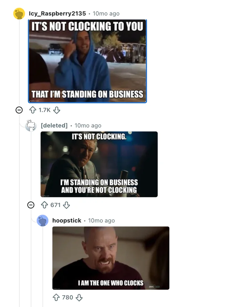 中文對標: 大概是“看穿”“點破”“真相了”這種。但“clock it”多了一層“我早就知道了/我注意到了”的dramatic效果。有點像是中文網絡梗裡“啊對對對”的反向變形——用陰陽怪氣的語氣形容一個事實。