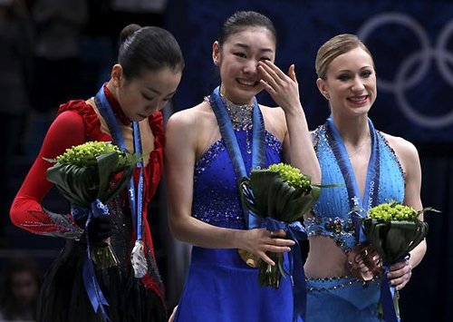 温哥华冬奥会花滑女单冠军金妍儿(中)亚军浅田真央(左)罗切特(右)