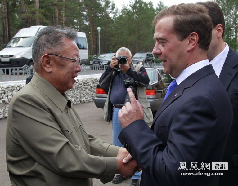 梅德韦杰夫热情欢迎金正日,称“很高兴见到您”,金正日回答到:“这是我们认识以来10年后的见面”。