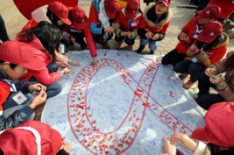 (兰州商学院青年志愿者协会的志愿者们,用成百上千个小红丝带在一块白布上粘出了一个足足有六七平方米的红丝带)