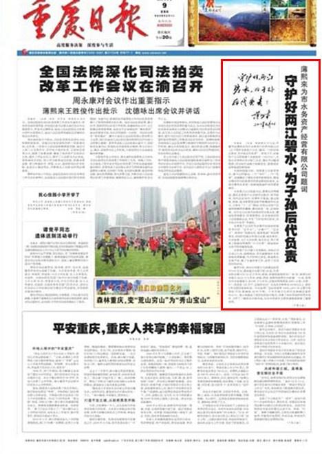 重庆日报头版刊登薄熙来题词“守护好两江碧水,为子孙后代负责”