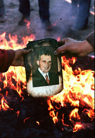 1989年12月22日,罗马尼亚民众焚烧齐奥塞斯库的照片,庆祝独裁者倒台。