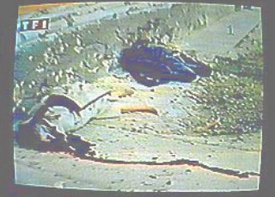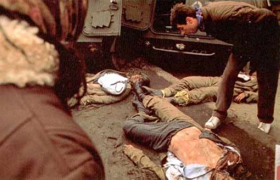 瓦西里偷偷向基地报告了自己的方位,并尽量升高,使雷达便于跟踪。最后,他对齐奥塞斯库说:“地面雷达已捕捉到我们,几分钟之后防空武器有可能使我们粉身碎骨。”齐奥塞斯库一听大为吃惊,要求立即降落到地面。直升机降落在布加勒斯特西北52公里处的一条公路上。图为齐奥塞斯库遭枪决时情景。