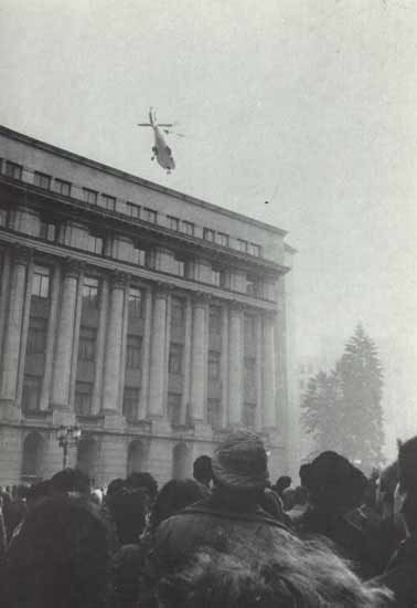示威群众立即汇成几股洪流向齐奥塞斯库所在的党中央大厦聚集,并向党中央大厦冲击。一些人打破一层楼的窗户,把齐奥塞斯库的著作和画像扔了出来。齐奥塞斯库夫妇看大事不好,下令调来直升机,从大厦的顶部平台逃走。12时10分,直升机起飞后向首都布加勒斯特北部郊区飞去。图为走投无路的齐奥塞斯库夫妇乘直升机从总统府仓皇出逃。
