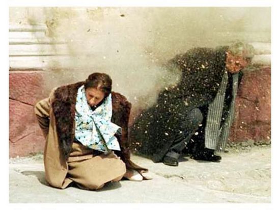 审判结束后,齐奥塞斯库夫妇一先一后被捆绑着押送到室外。兵营里没有刑场,厕所前的空地便成了执行枪决的地方。从楼房到刑场约有30米远。厕所有两扇窗子。齐奥塞斯库被带到了两扇窗子之间的墙下,面对着持枪的士兵站好。图为齐奥塞斯库夫妇被处决后的情景。