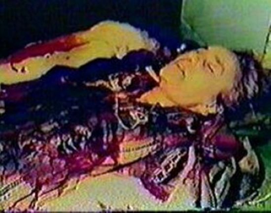 齐奥塞斯库夫妇被处决5天后,二人尸体被秘密埋葬在根恰公墓。此后,罗马尼亚官方一直未确认二人的墓地所在,而其家属也因此对所谓墓地拒不承认。在齐奥塞斯库夫妇唯一在世的儿子瓦伦丁·齐奥塞斯库及女婿奥普雷安的要求下,罗马尼亚国家法医学院于2010年7月21日开启了二人墓穴并进行开棺验尸。后经DNA检测,根恰公墓中的尸体确系齐奥塞斯库夫妇的尸体。图为齐奥塞斯库夫人遗容。
