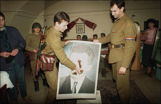1989年12月28日,倒向人民的罗马尼亚士兵用刺刀戳破齐奥塞斯库的画像。