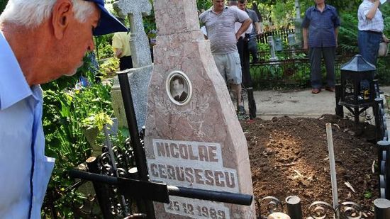 2010年7月21日,罗马尼亚首都布加勒斯特附近的根恰(Ghencea)公墓,人们聚集在罗马尼亚前总统齐奥塞斯库夫妇的墓前。在齐奥塞斯库夫妇唯一在世的儿子瓦伦丁·齐奥塞斯库及女婿奥普雷安的要求下,齐奥塞斯库夫妇的遗骸从坟墓掘出,当地法医将对尸体进行DNA检测,以确定其身份。1989年12月25日,罗马尼亚特别军事法庭判处齐奥塞斯库夫妇死刑并立即执行,但迄今为止,没有任何官方文件确认齐奥塞斯库夫妇最后安身之地所在。图为齐奥塞斯库的墓碑。