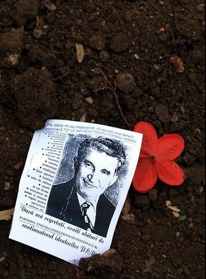 坟墓上散落着印有齐奥塞斯库照片的传单。1989年12月25日,齐奥塞斯库夫妇被处决后,由于担心坟墓被对其不满的民众破坏,罗马尼亚新政府决定连夜将齐奥塞斯库夫妇秘密埋葬。齐氏夫妇的子女一直为解开父母墓地之谜而同有关当局交涉。经过多年的法庭之争,罗马尼亚政府终于批准对齐奥塞斯库夫妇的遗体进行身份核实。传单标题写着,“他们枪毙了我,你们的生活更好了吗?”