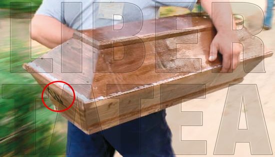 这个棺材上面刻有英文缩写NC(Nicolae Ceausescu,尼古拉·齐奥塞斯库)