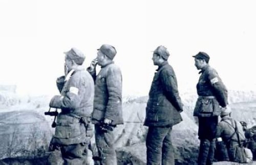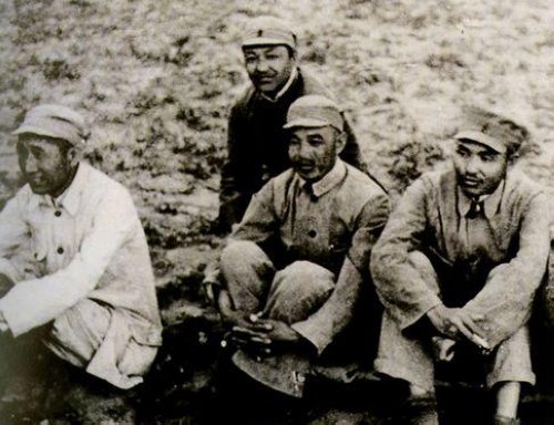 1947年3月,习仲勋(左三)与彭德怀等在陕北青化砭战场前线阵地上。