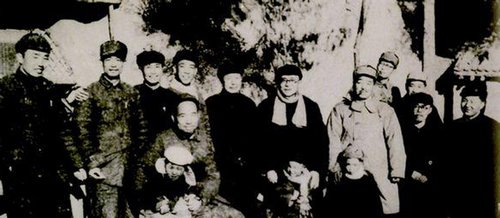 1947年冬,习仲勋(右一)左起:马文瑞、张邦英、张经武、李卓然(前)、贾拓夫、王维舟、林伯渠、贺龙、杨明轩等在陕北绥德县义合镇。