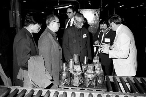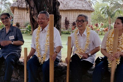 习仲勋(左二)和宋平(左一)参观夏威夷瓦胡岛的波利尼西亚文化中心。