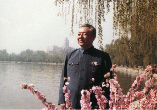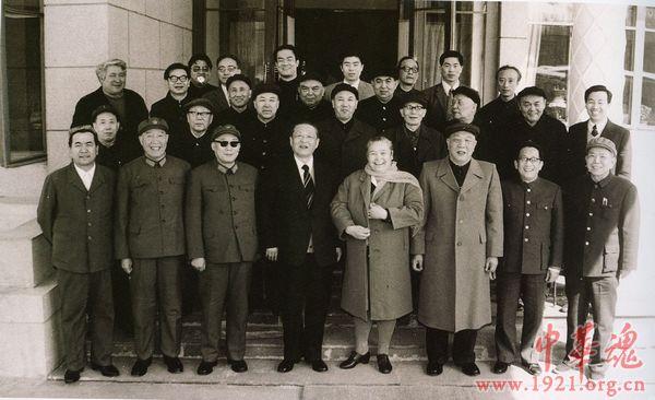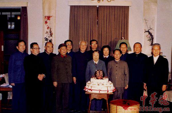 1984年1月(左起)田纪云、谷牧、姚依林、余秋里、李鹏、万里、胡启立、邓颖超、郝建秀、胡耀邦、乔石、习仲勋、邓力群祝贺邓颖超八十大寿。