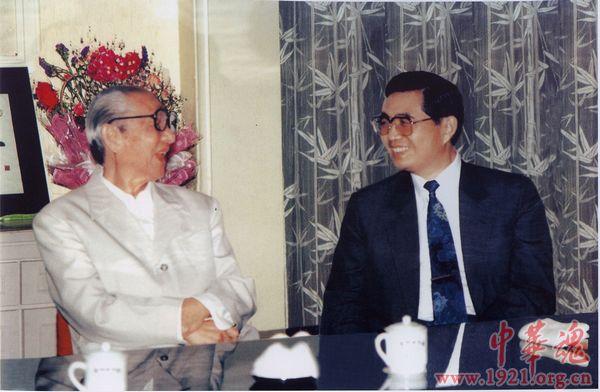 1994年11月12日,时任中共中央政治局常委、书记处书记胡锦涛在深圳与习仲勋交谈。