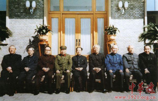 1981年(左起)习仲勋、方毅、谷牧、杨得志、胡耀邦、万里、姚依林、余秋里、王任重中南海合影。