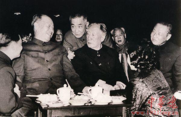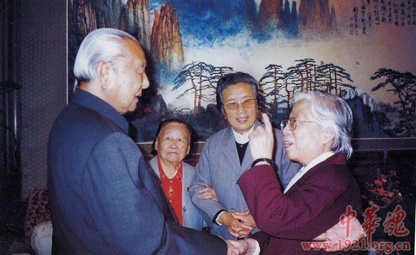 在建国50周年大庆期间,习仲勋在国宾馆宴请各位大姐。图为习仲勋与胡耀邦夫人李昭捂手交谈,左二为谢觉哉夫人王定国,右二为罗瑞卿夫人郝治平。