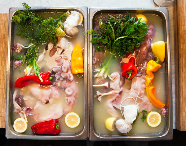 迪伦的章鱼肉浸泡在乳清、柠檬、辣椒、猪肉片和香料混合的汁液中。