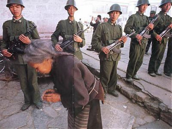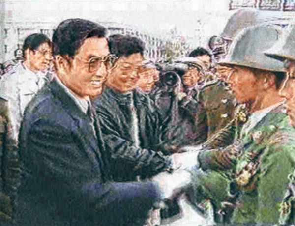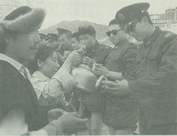 1989年3月7日,国务院总理李鹏发布在西藏自治区拉萨市实行戒严的命令:鉴于少数分裂主义分子不断在西藏自治区拉萨市制造骚乱,严重危害社会安定,为了维护社会秩序,保障公民人身、财产的安全,保护公共财产不受侵犯,根据宪法第89条第16项的规定,国务院决定,自1989年3月8日零时起在拉萨市实行戒严,由西藏自治区人民政府组织实施,并根据实际需要采取具体戒严措施。图为拉萨藏族群众慰问戒严部队官兵。