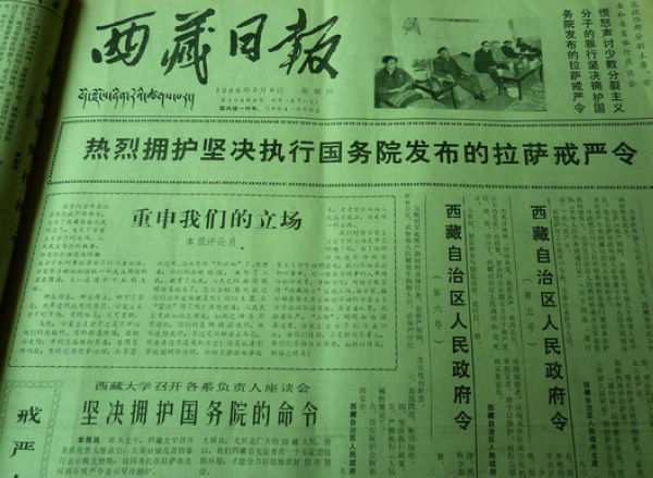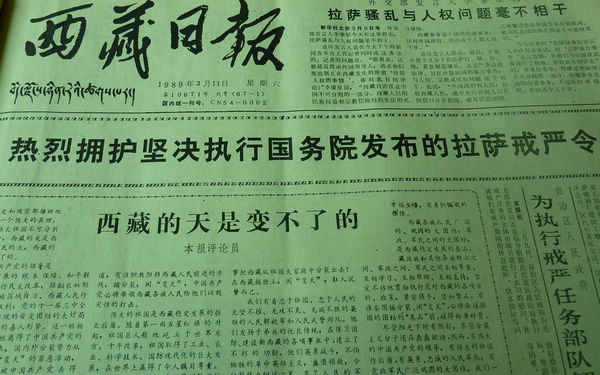 1989年3月7日,国务院总理李鹏发布在西藏自治区拉萨市实行戒严的命令:鉴于少数分裂主义分子不断在西藏自治区拉萨市制造骚乱,严重危害社会安定,为了维护社会秩序,保障公民人身、财产的安全,保护公共财产不受侵犯,根据宪法第89条第16项的规定,国务院决定,自1989年3月8日零时起在拉萨市实行戒严,由西藏自治区人民政府组织实施,并根据实际需要采取具体戒严措施。图为关于拉萨戒严的出版物。