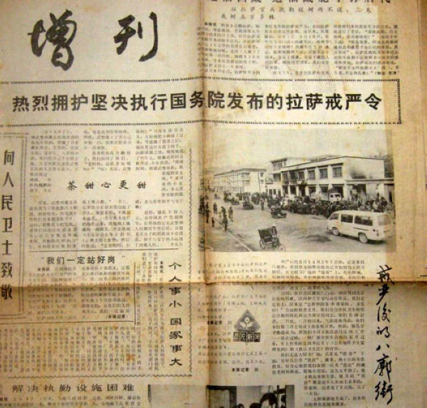12时刚过,大昭寺广场的人群中突然一阵骚动,只见十几个喇嘛、尼姑和青年呼喊着“西藏独立”的口号,一人手举着一面标志“独立”的“雪山狮子”纸旗举行非法游行。接着,队伍突然增至500多人。这些人多数戴着口罩,一些喇嘛、尼姑穿着便装,气势汹汹,呼喊叫骂。街上顿时大乱,商贩仓皇收摊,商店迅疾关门,一些行人慌忙离开。图为西藏日报关于戒严令的报道。