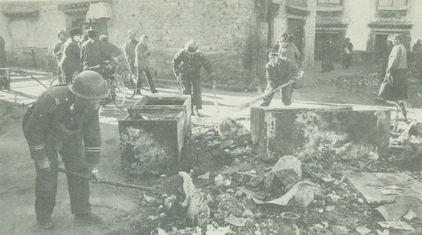 因此,国务院只有采取戒严措施,以保障公民人身、财产的安全,保护公共财产不受侵犯。对拉萨市的戒严在1990年5月1日起解除。图为戒严部队清扫骚乱分子破坏后留下的废墟。