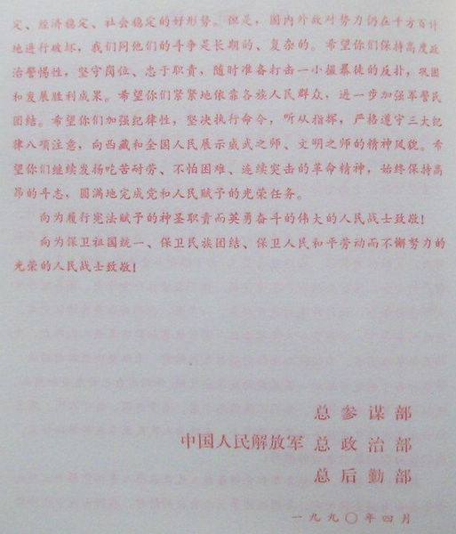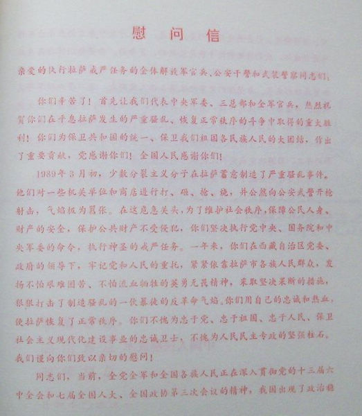 1989年3月7日,国务院总理李鹏发布在西藏自治区拉萨市实行戒严的命令:鉴于少数分裂主义分子不断在西藏自治区拉萨市制造骚乱,严重危害社会安定,为了维护社会秩序,保障公民人身、财产的安全,保护公共财产不受侵犯,根据宪法第89条第16项的规定,国务院决定,自1989年3月8日零时起在拉萨市实行戒严,由西藏自治区人民政府组织实施,并根据实际需要采取具体戒严措施。图为解放军四总部发出的嘉奖令。