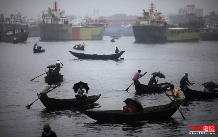 孟加拉有数千万人每天要乘船上下班。图为达卡居民打伞出行。