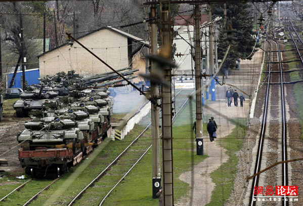 今年早些时候,乌克兰一直处于军事局势。注意图中的这些坦克是准备要用铁路运出的。