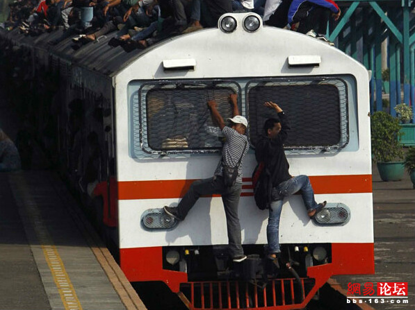 从火车门关闭的情形可以看出这趟火车确实很拥挤。