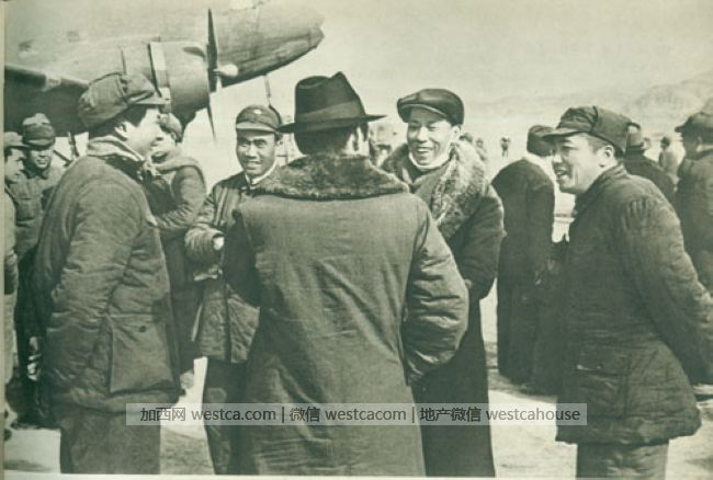 他说:“你这个人啊,平时总不来。信是不写则已,一写就是八万言。”这一席话使得两人都开怀大笑起来,他们手拉着手走进了颐年堂。由此可见,毛泽东的一席话一方面在无意间道出了长期以来彭德怀这个人从不善于做拉近乎,搞关系和结党营私的那一套,从另一方面也表明一旦到了关键时刻,彭德怀这个人又不得不向领袖慷慨陈词,奋笔疾书的正直性格。图为彭德怀1946.1.27在延安机场迎接出席蒋介石在重庆召开的政治协商会议会议,由重庆返回延安向党中央汇报的周恩来。左起:毛泽东、朱德、周恩来刘少奇彭德怀