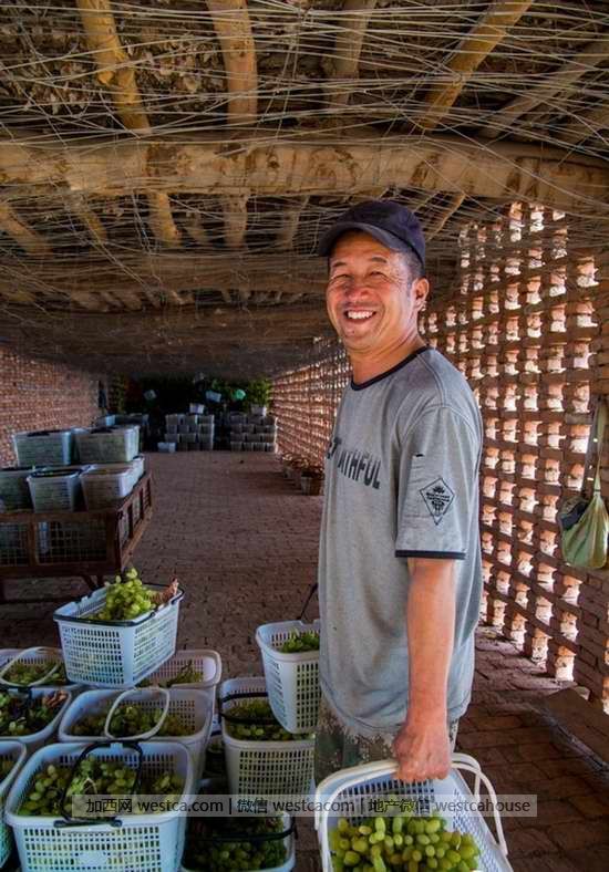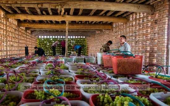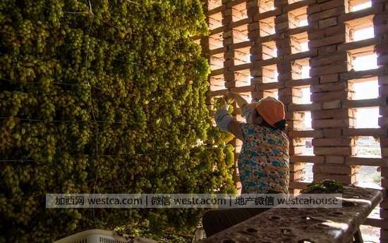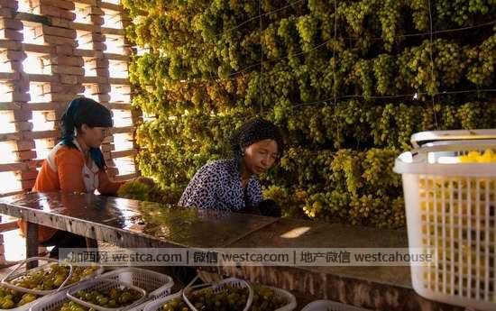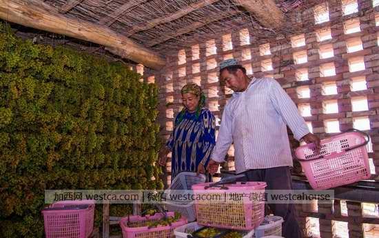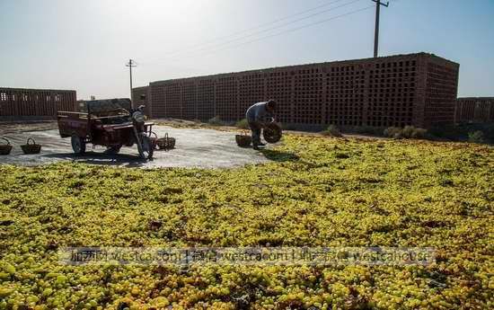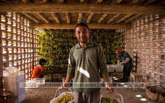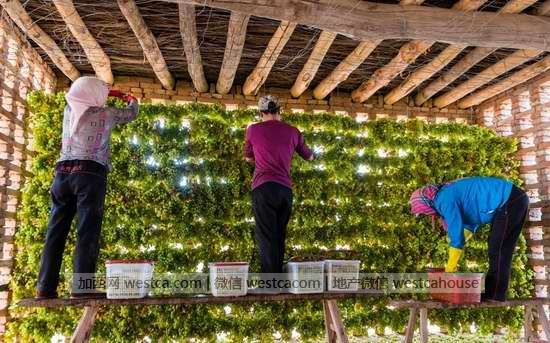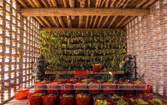 晾制葡萄干的“挂架”用碗口粗的长木加坚硬的红柳条制作而成,在圆木四周钻出等距离的圆孔,采用十字型方式将红柳条插入,“挂架”竖立与房顶预制好的挂件固定,与地面留有五十厘米左右的距离悬起,作用如同方格洞孔,易于自然风儿流动。每年金秋季节来临,这里便成了无核白葡萄的归宿。整个盆地的葡农们都重复着同一个动作:欢天喜地的钻进自家的葡萄园里,专心致志的采摘串串青翠甜美的葡萄,小心翼翼的剪去残枝败叶,兴奋愉快的装入杨树条编织而成的小筐子,欢歌笑语的用小毛驴车运到晾房,然后十分熟练的用双手将柔软的葡萄,一串串挂满红柳枝条。待整个工序完成,挂满葡萄的晾房,仿佛就像储满蜂蜜的蜂箱,角角落落都是甜蜜。