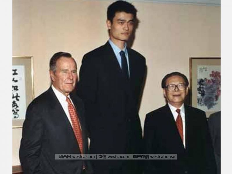 2002年10月24日,在位於美國得克薩斯州的喬治·布什總統圖書館發表重要演講後,中國國家主席江澤民與前總統老布什、正在休斯敦火箭隊效力的中國選手姚明合影。報道稱當時合影後江澤民問了姚明的身高,同時透露了自己有1.74m。