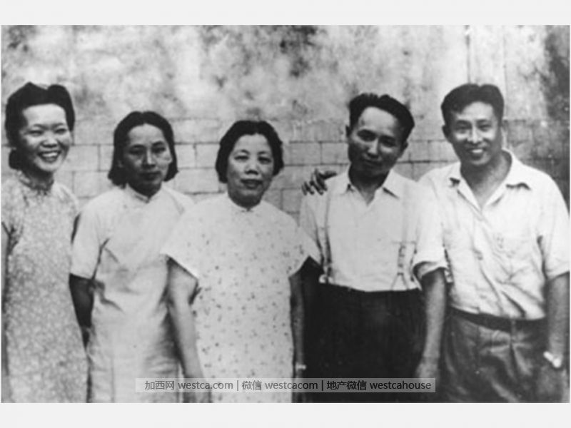 1946年,曾宪植进任中共南京局妇女组组长,从事妇女工作中的统战工作。图为曾宪植(左二)与邓颖超(中)、廖承志(右一)、范长江(右二)、经普椿(左一)在南京。