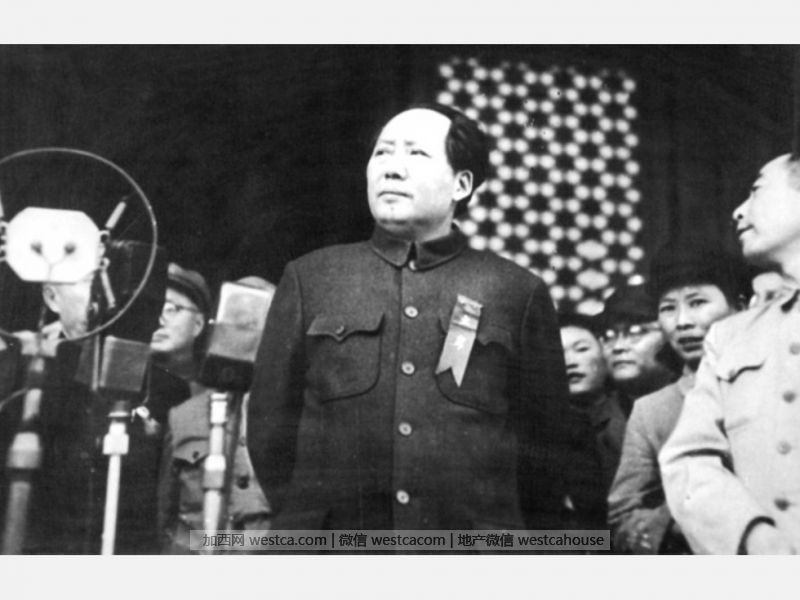 在开国大典仪式上,曾宪植(右二)与中共主要领导人在天安门城楼上。