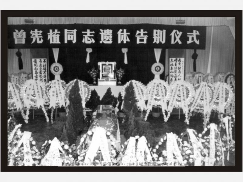 1989年10月11日,曾宪植在澳门病逝,20日在广州举行了向遗体告别仪式。王震参加遗体告别仪式,江泽民、杨尚昆、李鹏等中共领导人,港澳知名人士霍英东、马万祺、曾宪梓等送了花圈。图为其灵堂,灵堂中的挽联是曾宪植一生的真实写照:为党想,为人想,把荣誉推出去,把责任揽过来,斥骂赞许不顾,志比泰山胸若沧海;不计得,不计失,是真理拼命干,有意见当面提,上下亲疏弗论,情同白玉气贯长虹。