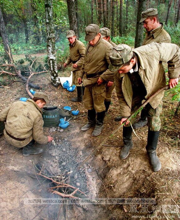在莫斯科东南部45公里的郊外,一名俄罗斯士兵正在用铲子扒烤熟的土豆。在当时的金融危机,军队只能依靠自己的物资来满足军队。