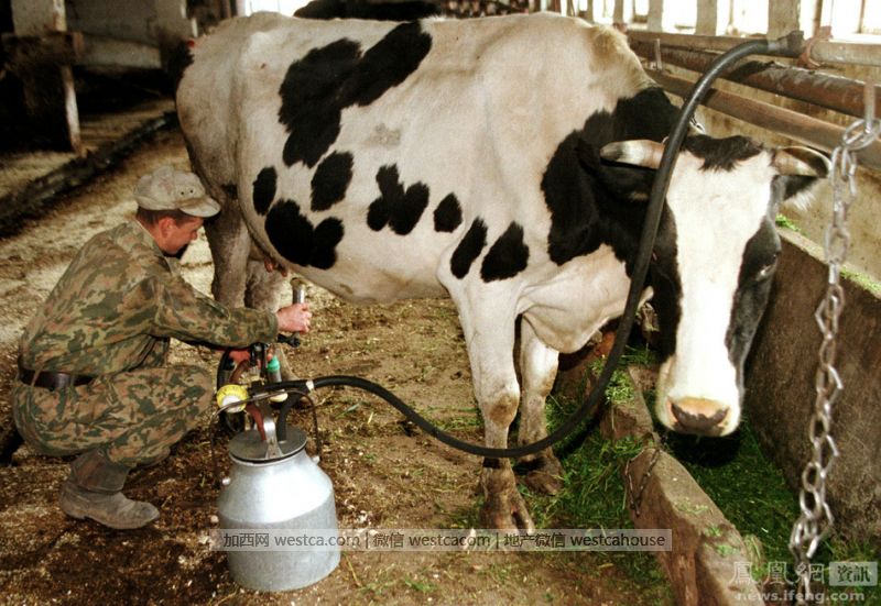 在莫斯科东南部45公里的郊外,一名士兵正在隶属于国防部的农场中挤牛奶。