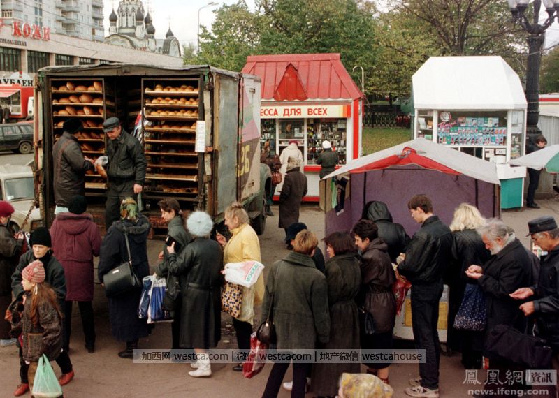 10月2日,莫斯科的市场上,顾客在卖面包的卡车前排队等待。当时那些养老金领取者和老人在遭受金融危机的俄罗斯更愿意购买大街上市场的商品,这里的价格一般比商店里少得多。